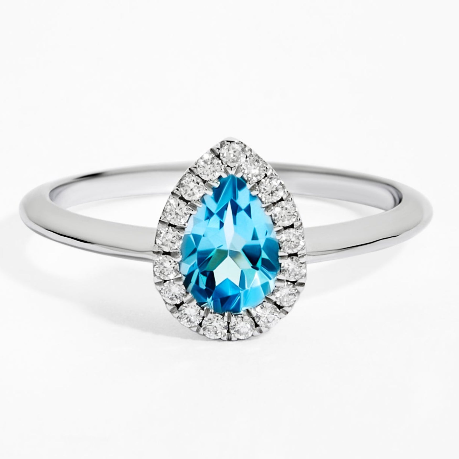 This luminous pear-cut Swiss Blue Topaz gemstone is framed by a delicate halo of brilliant diamonds, set on a polished white gold band for a crisp, timeless silhouette. Elegant yet vivid, it’s designed to catch the light beautifully on its own—and to stack effortlessly when you want a little more glow.