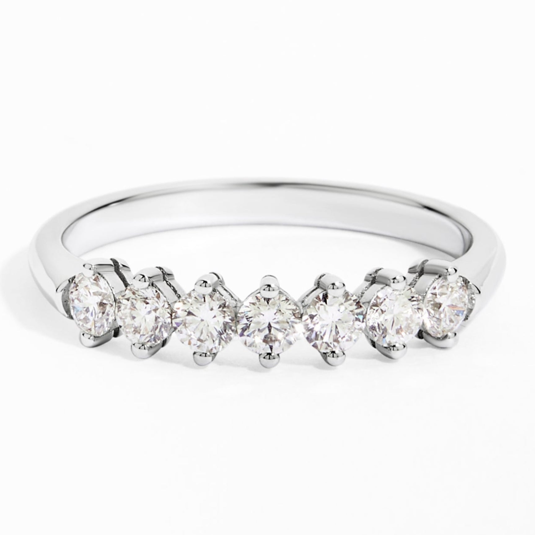 A refined white gold band set with seven round brilliant diamonds—each the same size—forming a perfectly balanced line of light across the finger. The prong setting keeps the look airy and luminous, while the smooth, polished shank makes it comfortable for everyday wear. Designed to be worn solo as a minimalist statement, or stacked as a radiant finishing touch beside engagement rings and eternity bands.