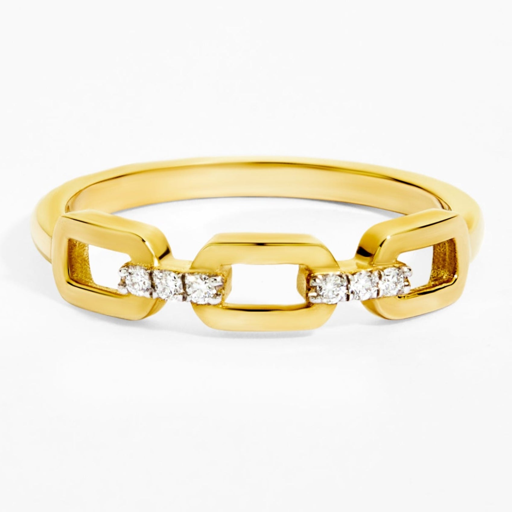 This modern chain-inspired ring is sculpted in polished yellow gold with three bold links, accented at the center by a fine row of diamonds for a subtle, unexpected flash. Strong enough to stand alone yet sleek enough to stack, it brings a confident edge to everyday wear.